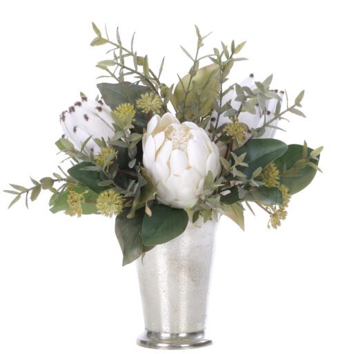 White Protea Eucalyptus Artificial Arrangement in Glass Vase / WF2129