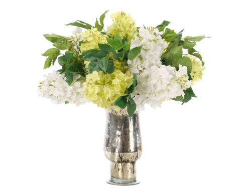 White Hydrangeas Faux Arrangement in Glass Vase / GF649