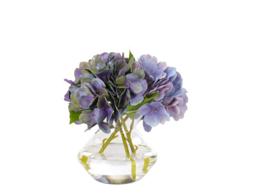 Blue Purple Hydrangea Faux Arrangement in Crystal Block Vase / BF214