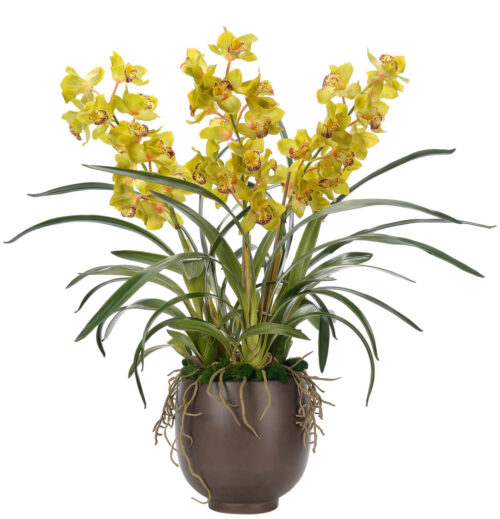 Green Cymbidium Orchids Silk Arrangement in Porcelain Bowl / GF654