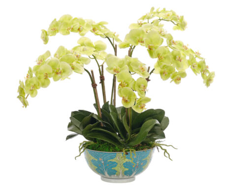 Green Phalaenopsis Orchid Silk Arrangement in Porcelain Bowl, 25″ H / GF668