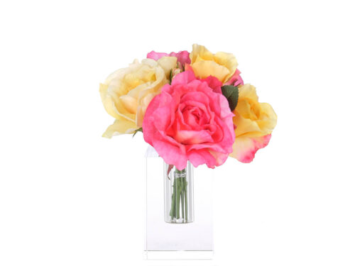 White Roses Silk Drop In Bouquet in Crystal Block Vase / WF066CD