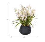 A striking accent piece, this white cymbidium orchid lifelike bouquet, styled in a textured metal pot. Petal textures and natural silhouettes give the look of freshly cut flowers. Unlike fresh flowers, it stays vibrant all year long with no upkeep. Exotic orchids bring sophisticated tropical styling to contemporary interiors. Measuring 43" W x 46" D x 50" H, it makes statement size suited for lobbies, reception areas, or event spaces. Perfect for creating a welcoming atmosphere with zero upkeep.