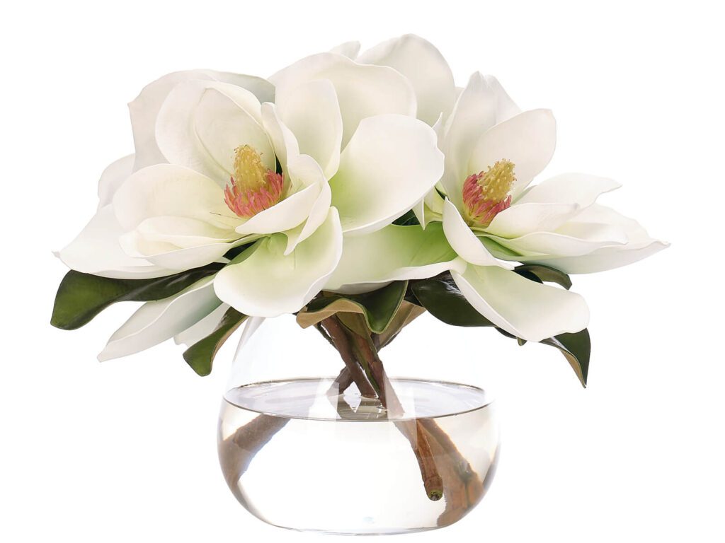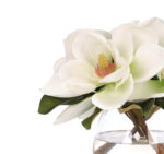 Crafted for realism, this white magnolias lifelike bouquet, styled in a glass vase. Watergarden designs display lifelike stems in crystal-clear, realistic "water" for a just-cut look that lasts. Hand-arranged in glass and ready to display, it stays flawless season after season. Petal textures and natural silhouettes give the look of freshly cut flowers. The piece maintains its color and shape, season after season. Large magnolia petals bring bold beauty and dramatic presence year-round. Measuring 16" W x 16" D x 11" H, it makes best displayed on desks, shelves, or vanity tables. A beautiful way to enjoy lifelike flowers without seasonal replacement.