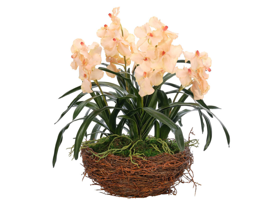 Elevate any space instantly with this apricot vanda orchid faux bouquet, set in a nest basket. Petal textures and natural silhouettes give the look of freshly cut flowers. Long-lasting design delivers enduring beauty with zero maintenance. These orchids offer refined elegance, perfect for modern and minimalist spaces. Measuring 28" W x 18" D x 29" H, it makes a perfect focal point for entryways, sideboards, or living rooms. An elegant solution for adding luxury faux florals to any room. Our sale selection features limited-quantity designer stems, at discounted prices, delivering the artistry NDI is known for, at an exceptional value. Quantities are limited. All sale items are final sale and non-returnable.